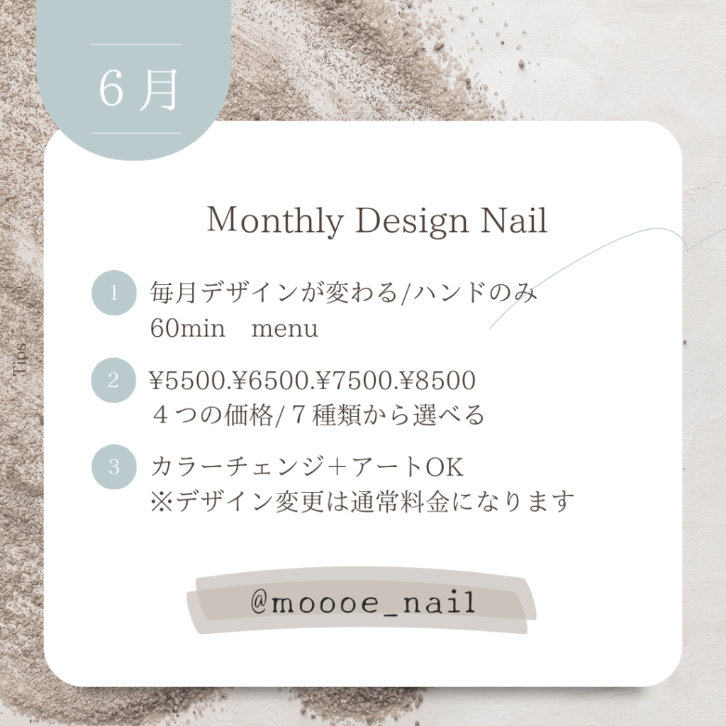 6月定額ネイルデザイン 2023 5/31 未分類 2023年5月31日 https://ameblo.jp/beautysalon-moooe/entry-12805403891.html 未分類 よかったらシェアしてね! URLをコピーしました! URLをコピーしました! 6月サロン&スタッフ別お休みお知らせ ✴︎お知らせ✴︎ この記事を書いた人 moe 関連記事 冬こそ大切なフットケア 2026年1月15日 ご挨拶 2026年1月11日 ☆6月ネイリストお休みお知らせ☆ 2024年5月30日 5月ネイリストお休みお知らせ☆ 2024年4月13日 BODY MENU☆ 2024年4月13日 4月定額ネイルデザイン☆ 2024年4月13日 4月サロンお休みのお知らせ 2024年3月21日 土曜日もランチ営業はじまりました☆ 2023年11月29日 コメント コメントする コメントをキャンセルコメント ※ 名前 ※ メール ※ サイト 次回のコメントで使用するためブラウザーに自分の名前、メールアドレス、サイトを保存する。 Δ