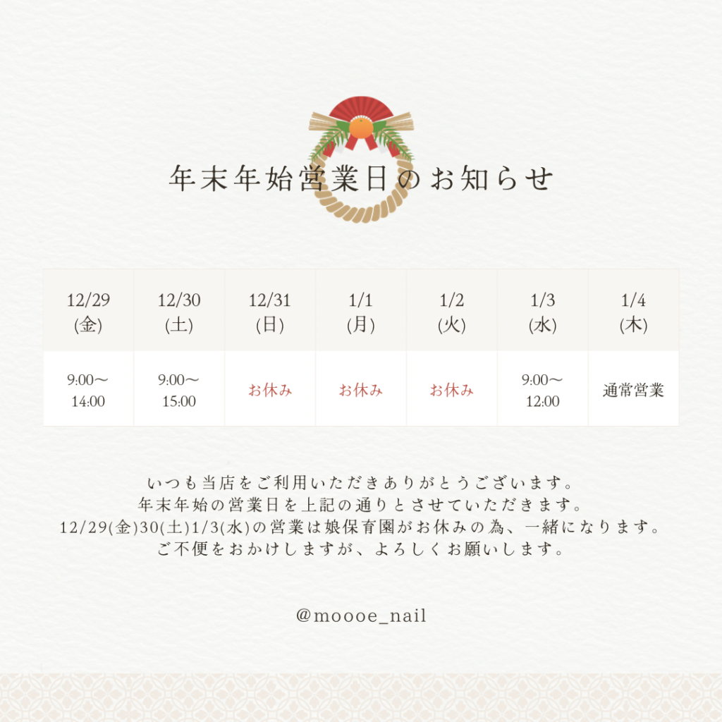 年末年始営業のお知らせ 2023 11/29 未分類 2023年11月29日 あわせて読みたい emu by moooe 横浜 反町 東神奈川 ネイルサロン アイラッシュ/フェイスワックス (エミューモエ) moooe_nailさんのブログです。最近の記事は「休日(画像あり)」です。 未分類 よかったらシェアしてね! URLをコピーしました! URLをコピーしました! 12月ネット予約受付開始☆ 土曜日もランチ営業はじまりました☆ この記事を書いた人 moe 関連記事 冬こそ大切なフットケア 2026年1月15日 ご挨拶 2026年1月11日 ☆6月ネイリストお休みお知らせ☆ 2024年5月30日 5月ネイリストお休みお知らせ☆ 2024年4月13日 BODY MENU☆ 2024年4月13日 4月定額ネイルデザイン☆ 2024年4月13日 4月サロンお休みのお知らせ 2024年3月21日 土曜日もランチ営業はじまりました☆ 2023年11月29日 コメント コメントする コメントをキャンセルコメント ※ 名前 ※ メール ※ サイト 次回のコメントで使用するためブラウザーに自分の名前、メールアドレス、サイトを保存する。 Δ